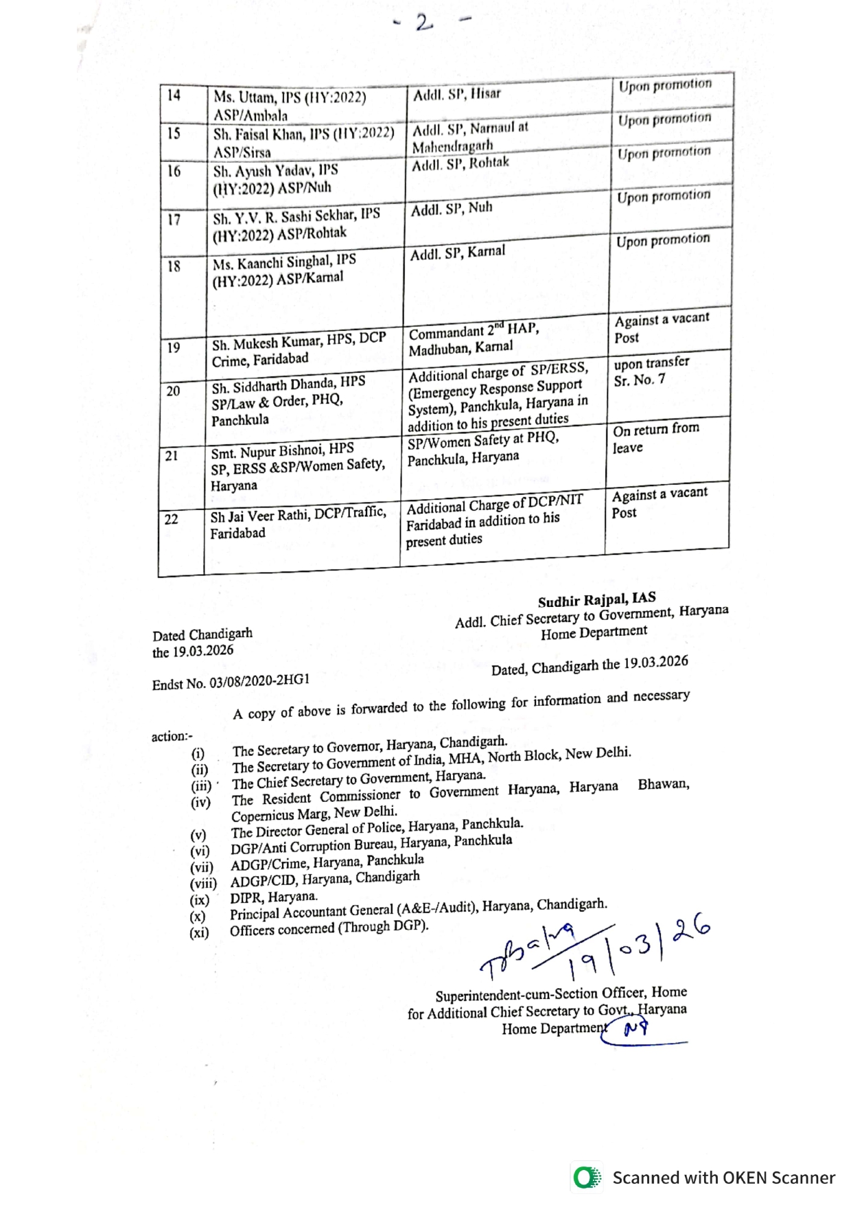 ਚੰਡੀਗੜ੍ਹ, 20 ਮਾਰਚ 2026 : ਹਰਿਆਣਾ ਸਰਕਾਰ (Haryana Government) ਵਲੋਂ ਹਾਲ ਹੀ ਵਿਚ 22 ਆਈ. ਪੀ. ਐਸ. ਅਧਿਕਾਰੀਆਂ ਸਮੇਤ 34 ਪੁਲਸ ਅਫ਼ਸਰਾਂ ਦੇ ਤਬਾਦਲਾ ਹੁਕਮ (Transfer order) ਜਾਰੀ ਕੀਤੇ ਗਏ ਹਨ । ਜਿਨ੍ਹਾਂ ਦੀ ਸੂਚੀ ਇਸ ਤਰ੍ਹਾਂ ਹੈ :